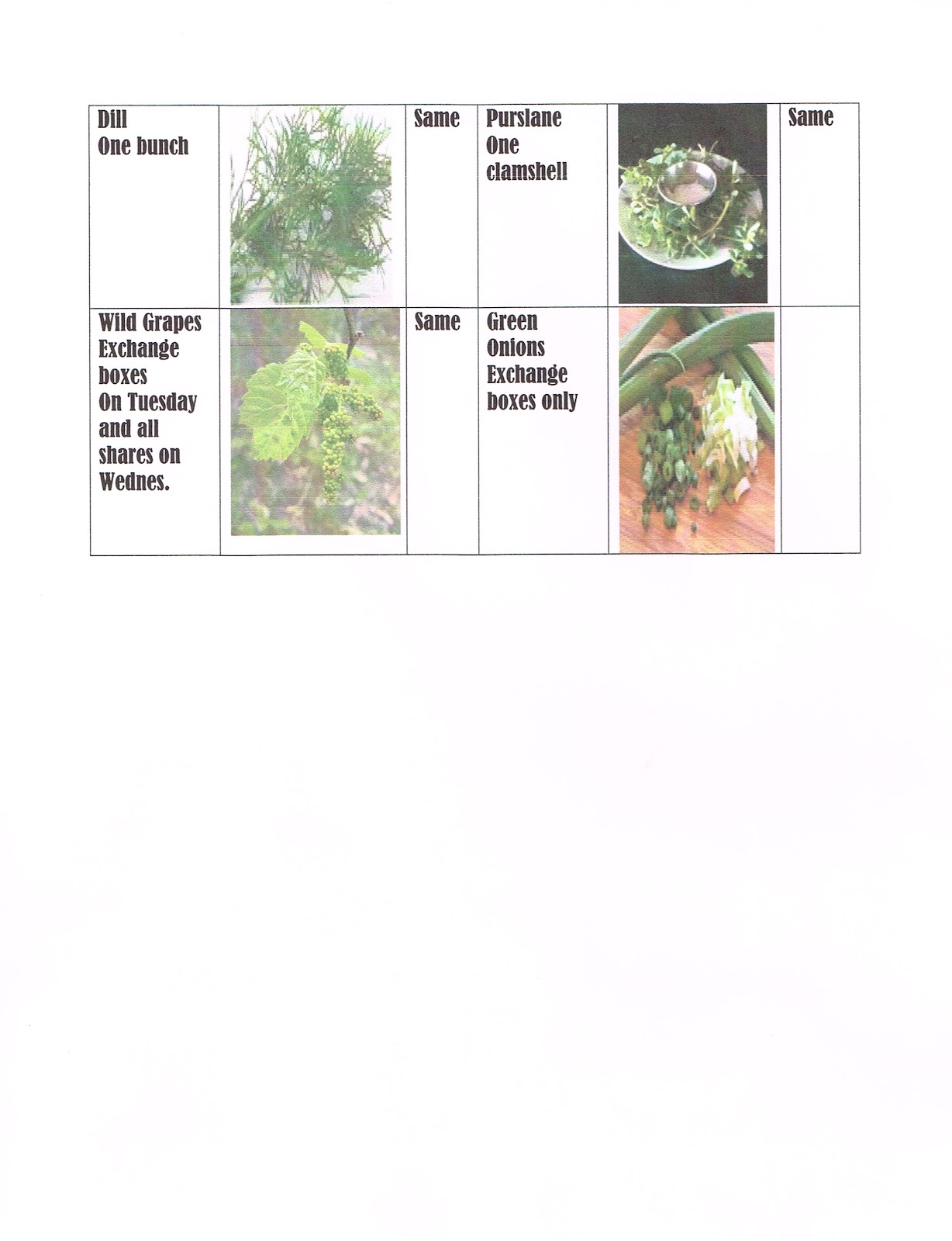 Daughter Tessa discovered an enormous bumper crop of our normally meager sour wild grapes. Too late to get in any but the trade in shares on Tuesday, we put our wild grapes in all shares on Wednesday. Yes, they’re somewhat sour, but so tiny that they can be enjoyed by anyone–even sour grape haters; just throw in a smoothie if you like your grapes sweet. These are seedless and really flavorful!