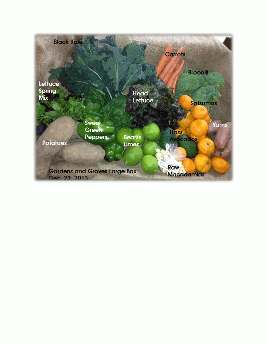 Wow, trucks on the road this Monday at 7:45 a.m., as we aren’t harvesting or delivering on Christmas Day or Christmas Eve….so all three county deliveries: Riverside, San Diego and OC are being done today. We were up really late finishing up the macadamia packs for all Gardens n’ Groves boxes, and were back in the barn at 4:00 a.m. to get everything finished up. Here’s an image of the Large Garden and Grove Box at right: